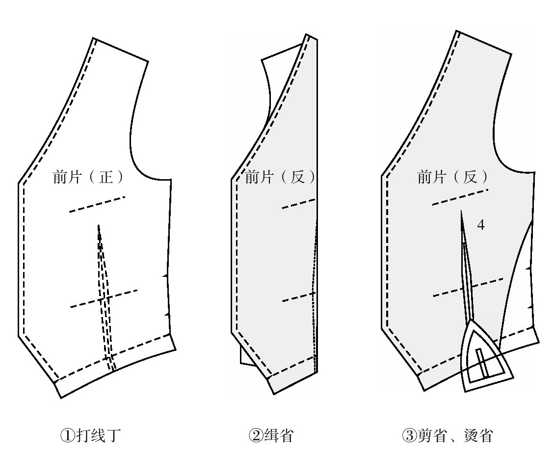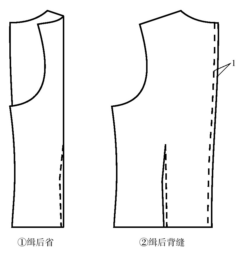 (1)缉后省:按照大小缉缝收省,要求缉线顺直,上下松紧一致。后片面的省缝倒向侧缝,后片里的省缝倒向后中。
