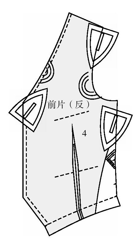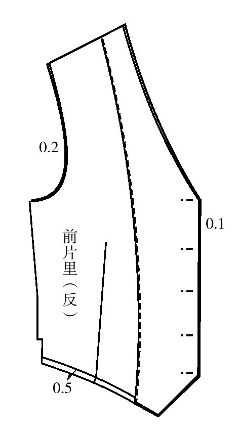 (1)前片面与里正面相对,袖窿按0.7cm的缝份缝合,底边按1cm的缝份缝合,袖窿弯处打几个剪口,将缝份倒向大身。翻出止口,让袖窿里坐进0.2cm,底边里坐进0.5cm。