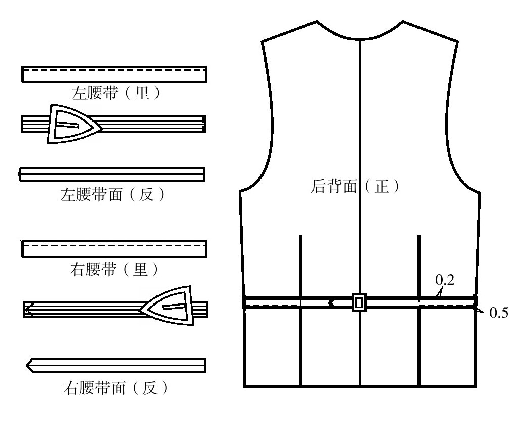 (1)做腰带:按净线缉缝,翻出后烫平,左侧腰带装上腰扣,右侧腰带做成宝剑头。