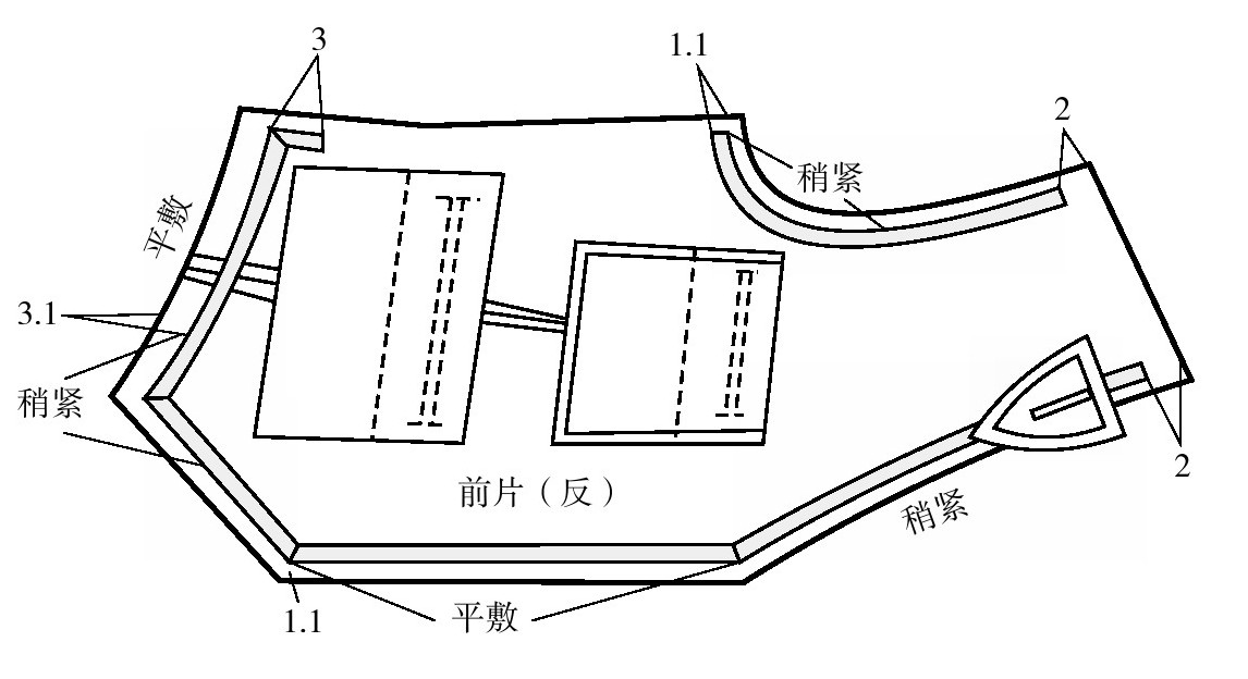 5.敷牵带(图10-10)采用1.2cm宽的牵带,沿净缝线偏进0.1cm敷牵带。从肩缝下2cm处开始,领口部位稍紧,止口平敷,门襟下角略紧,底边平敷。袖窿从肩缝下2cm处起,袖窿弯处适当拉紧。