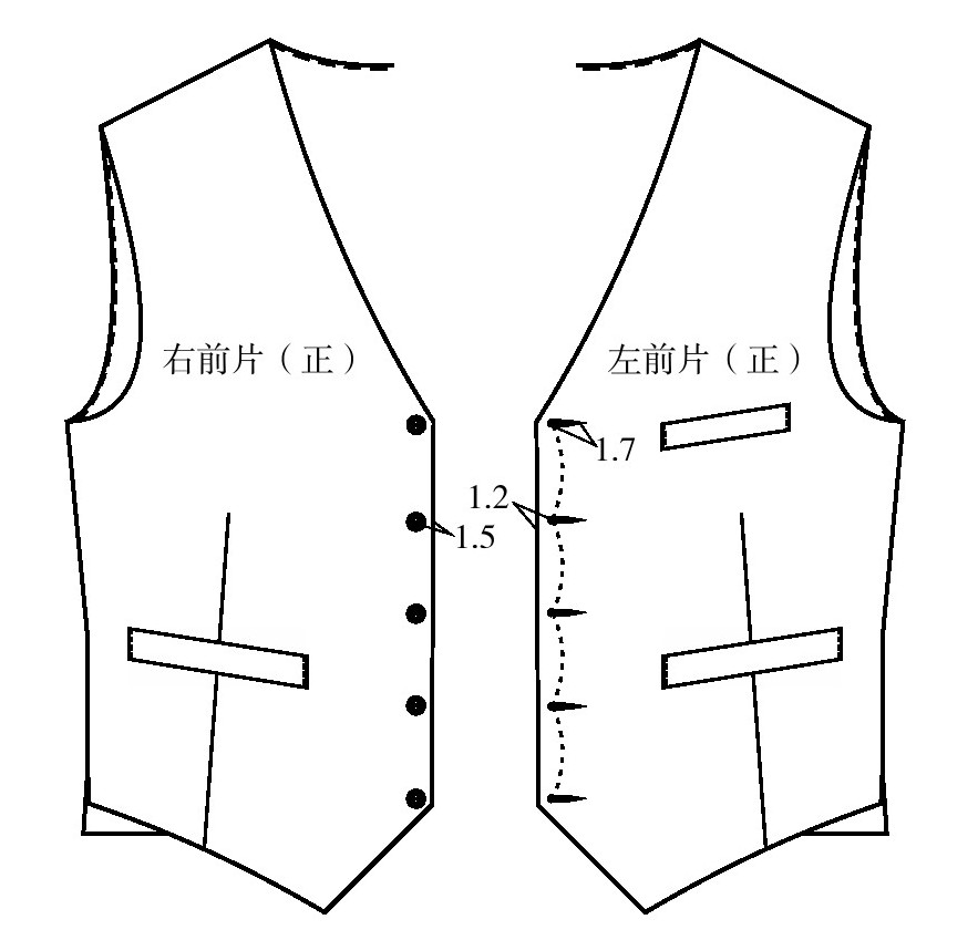(2)锁扣眼、钉纽扣:门襟锁圆头扣眼5个,扣眼大1.7cm,距止口1.2cm。在里襟相对应位置钉纽扣,纽扣直径1.5cm,纽扣边缘距止口1.5cm。