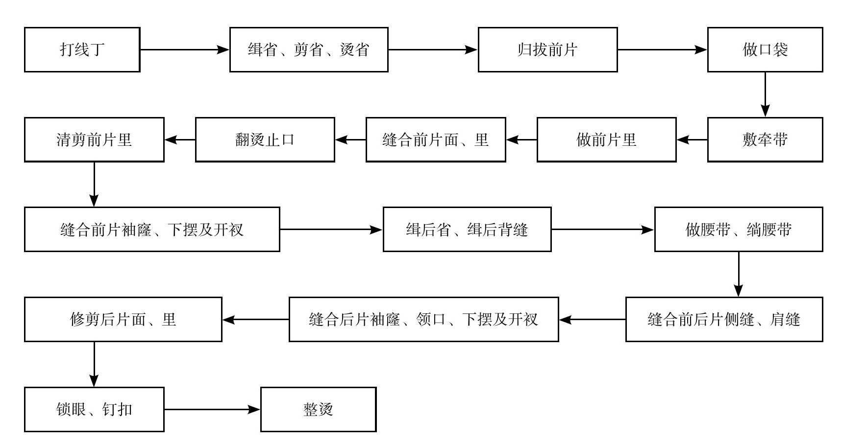 1.打线丁 打线丁是用线在裁片上做标记。将裁片正面相对,用白棉线打线丁,一般线头留0.3cm左右。打线丁的部位有前止口、底边、开衩、大小袋口、腰省等处。