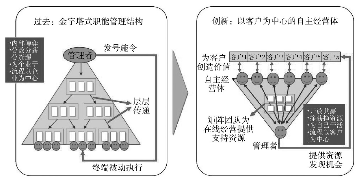 传统企业多采用垂直管理型的上下级组织架构,将权力集中在高层管理人员手中,个人或者团队没有一定的决策权利,在一定程度上易导致决策失误。而产品小组制将直线职能制打散、重组,每个小组均由设计师、商品制作专员,订单管理专员组成(每个小组2~3人),每3~5个小组产生1个主管,每3~5个主管产生1个部门经理。管理模式对比图如图3所示。