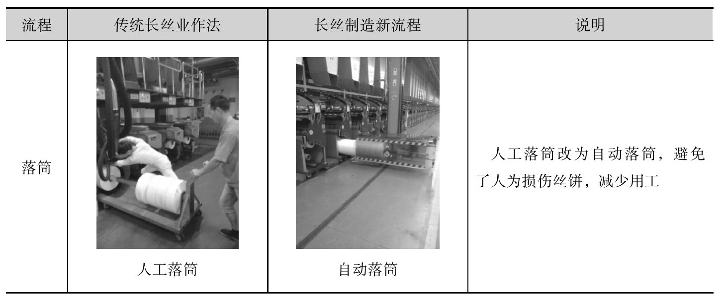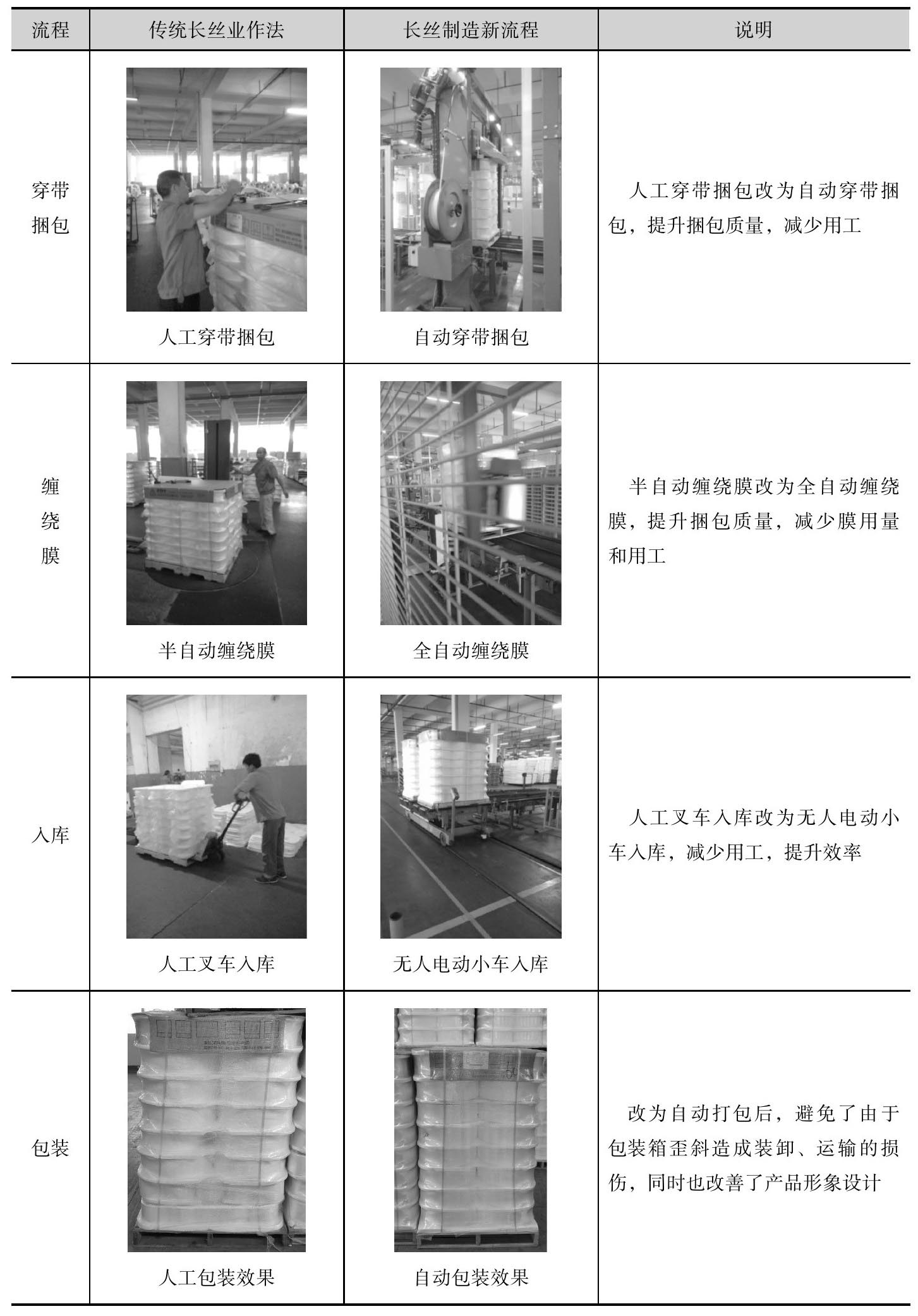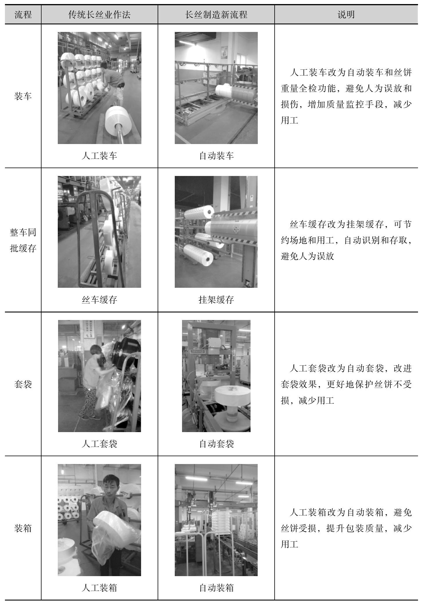 流程再造针对卷绕落筒、丝饼重量检测、套袋、打印纸管内标签、套袋、码垛、捆包、缠绕膜及入库工序,以往全部手工完成改成全部由机器人或流水线完成。