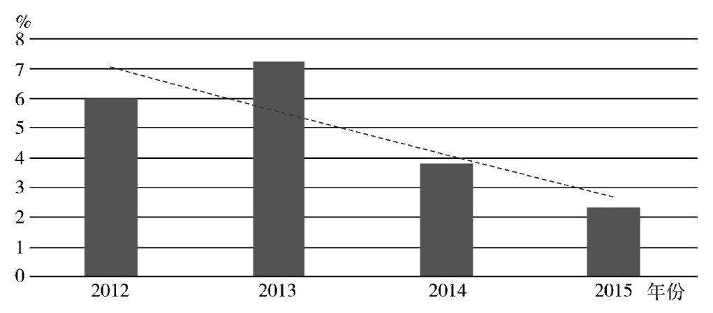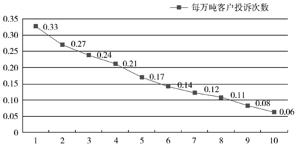 在产品质量方面,2014年,该成果基本覆盖POY系列品种,由于降低了差错率及人为对品质的损伤,综合优等率提升0.5%,产品内在品质显著提升,企业制造的理念得到国内外高端客户的认可,高端客户比重由20%上升到35%。2014年,集团长丝产量增加51.7万吨,客户数量增长44%,全流程自动化的生产精细化管理的高品质保证为拓展客户提供了保障,产品销售率稳定在99%以上,在客户数量大幅增加的同时,客户投诉次数由0.33次/万吨下降至0.06次/万吨以下,在10个月时间客户投诉次数下降了5.5倍,2015年客户投诉继续下降至0.04次/万吨。如图8所示。