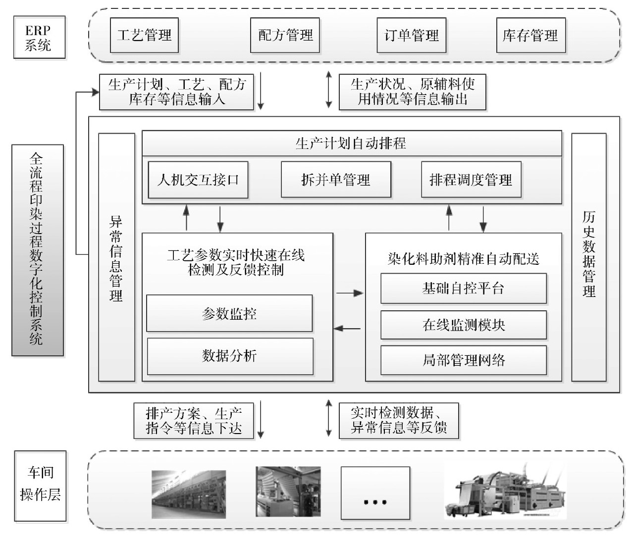 (1)ERP与生产一线融合,实现无缝对接。紧密围绕客户需求,通过物联网(IOT)和集散控制(DCS)技术管控生产过程的运行情况,通过高级计划排程系统(APS)技术,对生产任务进行排程,印染生产过程全面监控,实现了全流程印染生产数字化控制。具体表现在:建立了染整生产参数监控数据链、自积累工艺知识库和相关数据分析模型,实现了生产参数实时快速在线监测及反馈控制;全面提升染化料助剂生产流程的自动化程度,实现了染化料助剂精准自动配送;设计了印染生产计划排程的调度模型,在生产计划自动排程方面实现管理突破。