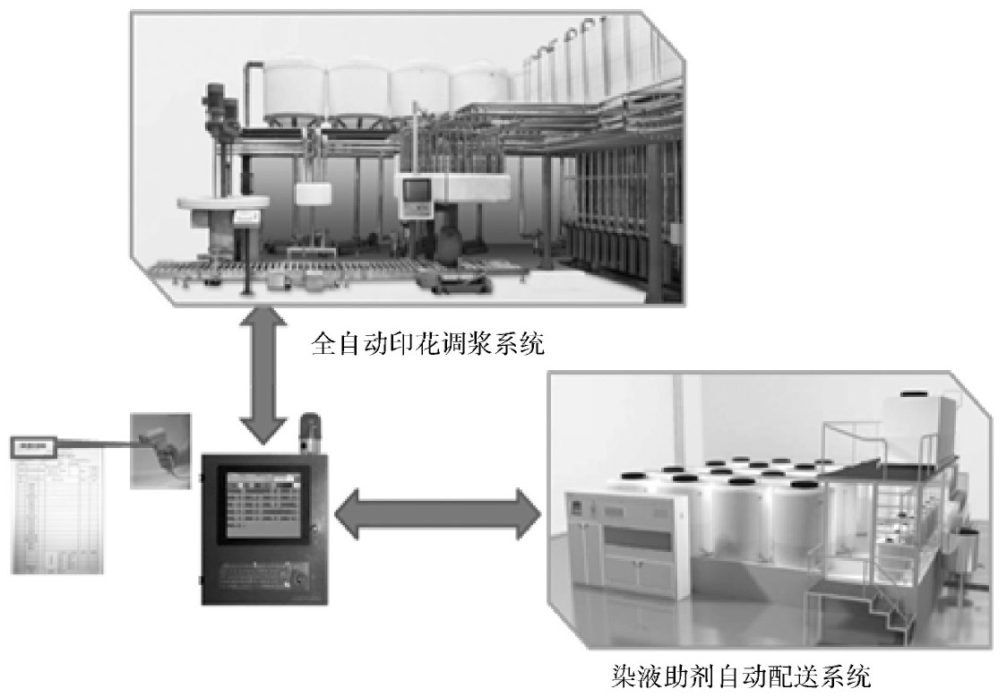通过解决染化料助剂自动配送关键技术问题,建立了染化料助剂的自动配送平台,全面提升生产流程(包括原料称量、化料搅拌、上料、储存、发料、检测、反馈、加料等环节)的自动化程度;实现了染化料助剂的在线监测,有效采集、处理、存储以及反馈相关信息,确保助剂和染液在浓度、黏度等方面达到预期标准,提高染化料助剂配送的精度和效率;实现了染化料助剂配送系统的一体化管理网络,建立系统内各模块的通信网络,形成具有数据处理、管理控制、自适应学习、参数预测等能力的局域网,并且能够与生产总线、自动排程系统保持紧密联系和实时通信,实现高效管理。图4为印染染化助剂系统示意图。