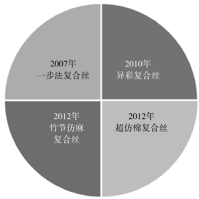 (3)技改型。该方法是在原有技术基础上对老产品进行局部改进,以增加花色品种、规格型号,提高产品质量,增加产品功能,提供材料利用率,节省能源。改进型产品创新主要用于该产品的市场尚未饱和,并且原产品的缺陷或不足已经影响到企业的经济效益,如公司对阳离子多异混纤丝进行技改为异彩阳白、异彩白阳、异彩竹节复合纤维。见图1。