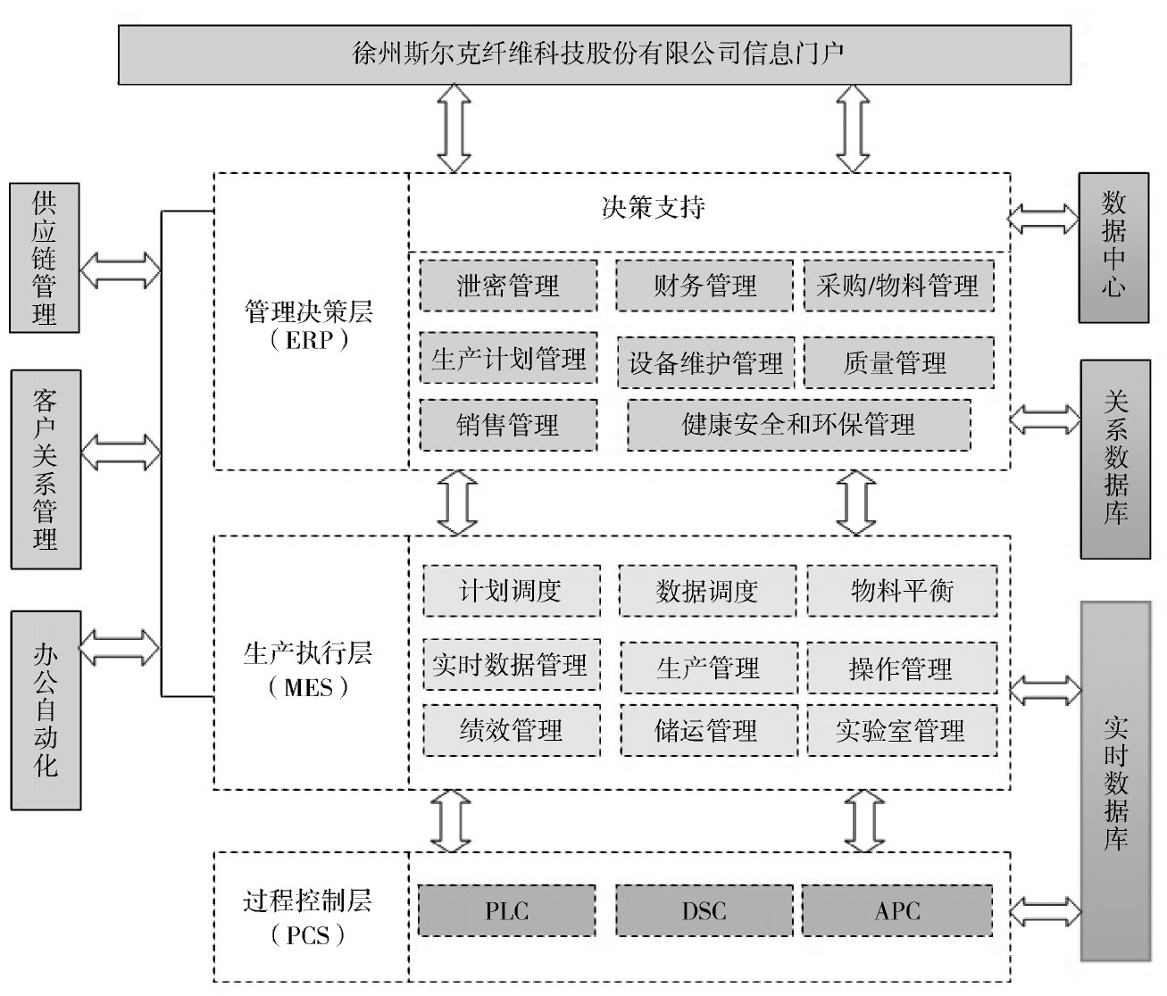 斯尔克公司生产全流程智能化集成系统,采用分层分布式结构,总体上分为三个部分:管理决策层、生产执行层和过程控制层。
