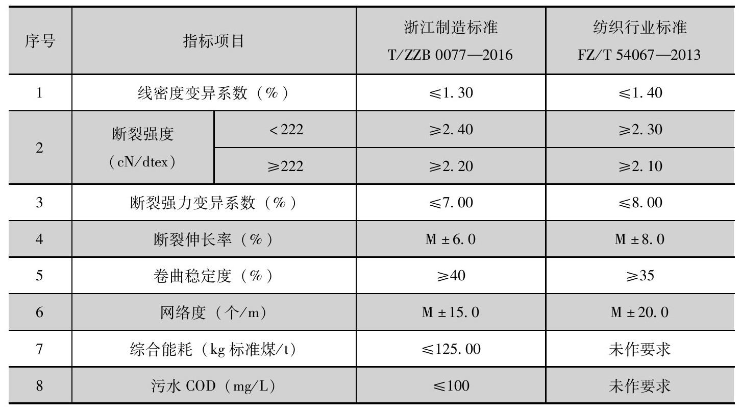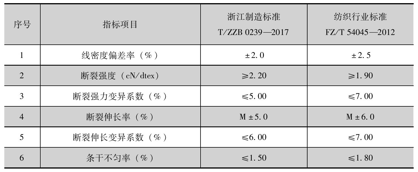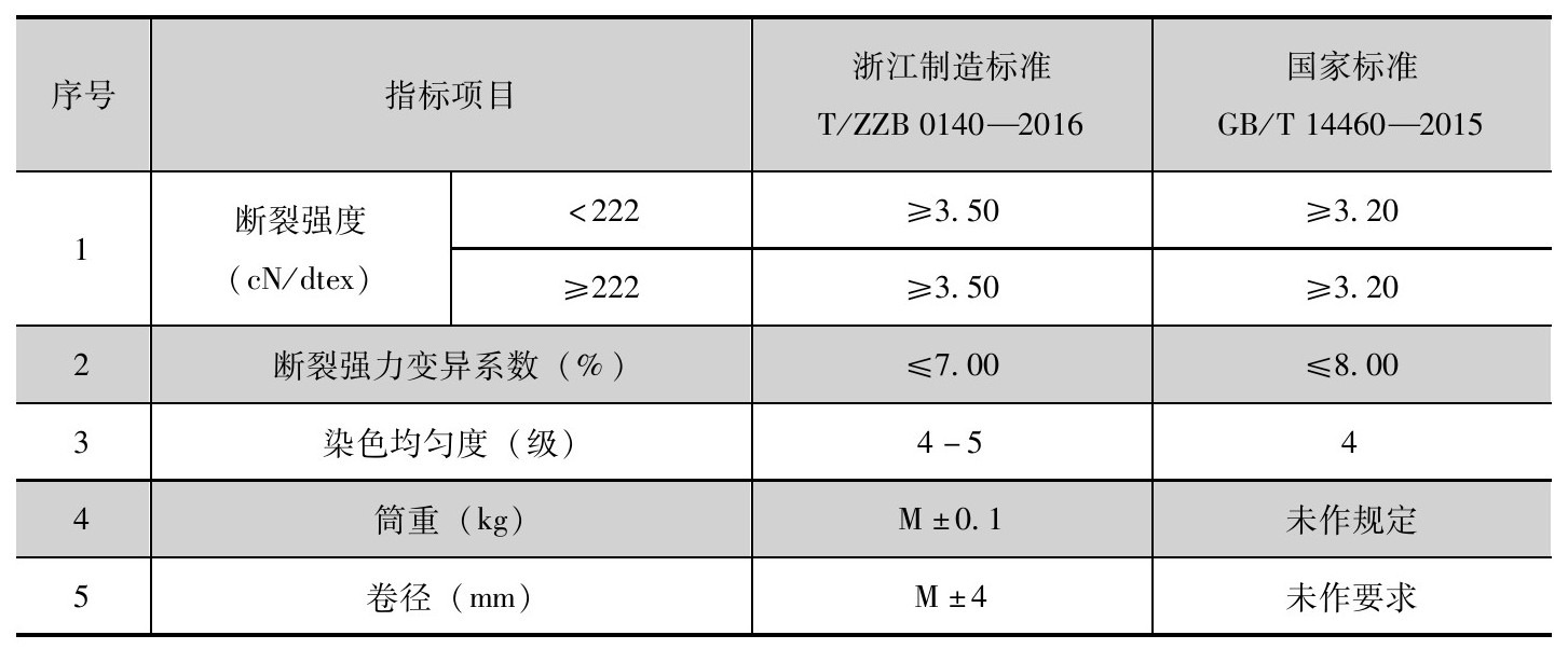 其重点是通过标准的制定,规范熔体直纺扁平涤纶预取向丝的生产和质量标准,提升标准和产品档次,其核心内容为标准提档、质量升级、智能制造。2017年9月12日该标准获得浙江省品牌建设促进会批准颁布。该浙江制造标准指标与国家标准指标的比较见表3。
