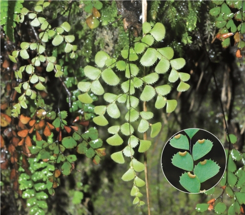 ●描述:陆生蕨类。叶疏生,叶柄深栗色,叶片三角状卵形,三回羽状;羽片3~5对,基部1对最大,长三角形,二回羽状,小羽片4~5对,基部1对椭圆形;复叠,扇形,顶部圆,具短宽三角形密锯齿;叶脉多回二歧分叉,达锯齿尖端,两面明显;叶干后坚草质,两面光滑;叶轴、各回羽轴和小羽柄均与叶柄同色,光滑。孢子囊群每末回小羽片1~2枚;囊群盖肾形或圆肾形,褐色,全缘,宿存。