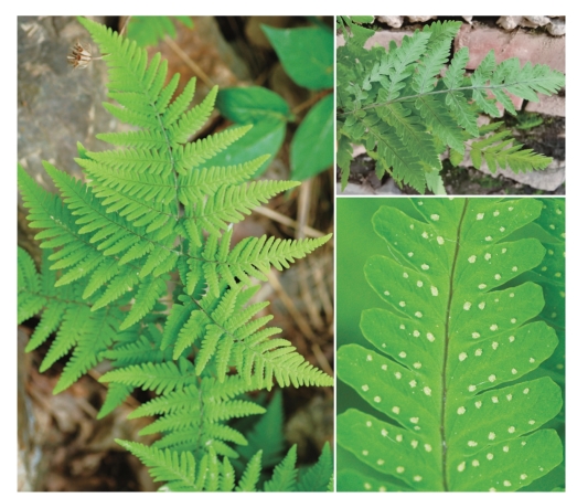 ●描述:陆生蕨类。根茎细长横走,顶端和叶柄基部有棕色卵状披针形鳞片。叶疏生;叶片卵状三角形,叶片二至三回羽状,羽片5~8对,对生,斜上,下部的有柄,具关节着生叶轴,基部1对长三角形,二回羽裂,末回裂片全缘或有浅圆齿,侧脉单一,偶2叉;叶厚草质,上面淡绿色,下面浅绿色;叶柄上部和叶轴及羽轴下部(特别是基部羽片)有淡黄色小腺体。孢子囊群小,圆形,背生于侧脉中部;无盖。