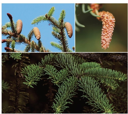 ●描述:乔木。一年生嫩枝淡黄绿色,常有白粉;老枝淡褐色。叶较粗,四棱状条形,近辐射伸展,或小枝上面之叶直上伸展,下面及两侧之叶向上弯伸,先端钝,或具钝尖头,横切面四棱形,四面有气孔线,上面每边5~7条,下面每边4~6条。球果圆柱形或矩圆状圆柱形,成熟前种鳞背部露出部分绿色,上部边缘紫红色;中部种鳞倒卵形,先端圆,边缘全缘或微成波状;苞鳞短小,三角状匙形;种子斜倒卵圆形。
