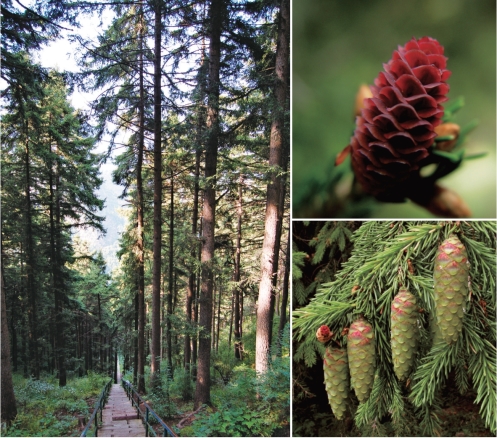 ●描述:乔木。树皮淡黄灰或暗灰色,浅裂成不规则麟状块片脱落。冬芽卵圆形,稀圆锥状卵圆形,无树脂。叶四棱状条形,直或微弯,先端尖,横切面四菱形或扁菱形,四面各有气孔线4~6条,无白粉。球果卵状圆柱形或圆状长卵形,顶端钝圆,熟前绿色,熟时黄褐色或淡褐色;中部种鳞倒卵形,种鳞上部圆形或急尖,或呈钝三角状,背面无明显的条纹。