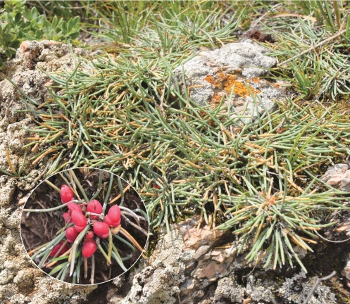 ●描述:草本状矮小灌木。木质茎短小,多分枝;绿色小枝常微弯,通常开展,节间细短。叶2裂,1/2以下合生,裂片短三角形,先端钝或尖。雄球花生于小枝上下各部,单生枝顶或对生节上,多成复穗状,苞片3~4对;雌球花单生或对生节上,无梗,苞片3对,基部合生,雌花1~2枚,胚珠的珠被管通常较长而弯曲,成熟时苞片肉质红色,被白粉,最上1对苞片约1/2分裂。