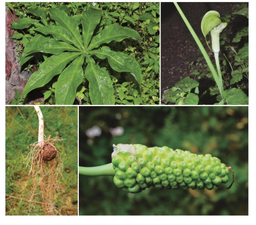 ●描述:多年生草本。块茎扁球形。鳞叶绿白或粉红色,有紫褐色斑纹;叶放射状分裂,裂片由3~20枚不等,披针形至椭圆形;佛焰苞绿色,背面有白色或淡紫色条纹。雄肉穗花序花密,雄花淡绿至暗褐色,雄蕊2~4枚,附属器下部光滑;雌花序附属器棒状或圆柱形。成熟浆果红色。