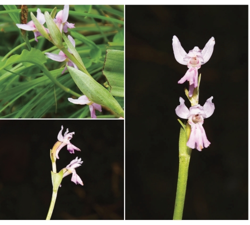 ●描述:地生草本。茎基部具2~3枚筒状鞘,鞘之上具叶。叶1枚,罕2枚,基生,叶片卵形、卵圆形或狭长圆形,直立伸展,先端钝或稍尖,基部收狭成抱茎的柄。花序具1~5朵花,常偏向一侧;花苞片卵状披针形至披针形;子房纺锤形,扭转;花紫红色,萼片近等大,中萼片直立,凹陷呈舟状,具3脉,与花瓣靠合呈兜状;侧萼片直立或稍张开,偏斜,具3脉;花瓣直立,具3脉;唇瓣向前伸出,平展,基部具距,前部3裂,侧裂片扩展,边缘波状;距圆筒状,下垂,稍向前弯曲。