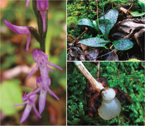 ●描述:地生草本。茎基部具2枚近对生的叶,其上具1~4枚小叶;叶卵形、卵状披针形或椭圆形,先端尖或渐尖,基部短鞘状抱茎,上面有时具紫红色斑点。花序具几朵至10余花,常偏向一侧;苞片披针形;花紫红或粉红色;萼片在3/4以上靠合成兜,中萼片披针形;侧萼片斜镰状披针形;花瓣披针状线形,与中萼片贴生;唇瓣前伸,上面和边缘具乳突,基部楔形,3裂,侧裂片线形,中裂片长;距细圆筒状锥形,中部前弯,近“U”字形。