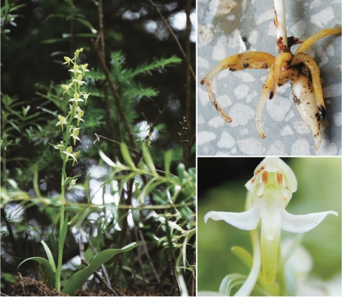 ●描述:地生草本。茎较粗壮,近基部具2枚近对生的大叶,其上具2~4枚披针形小叶;大叶椭圆形、或倒披针状椭圆形,基部鞘状抱茎。花序具12~32朵花;苞片披针形,最下部的长于子房;子房上部钩曲;花绿白或白色,中萼片舟状,圆状心形,侧萼片张开,斜卵形;花瓣直立,斜窄披针形,与中萼片靠合呈兜状;唇瓣前伸,舌状,肉质,距棒状圆筒形,水平或斜下伸,微钩曲或弯曲,向末端增粗;柱头1枚,凹入,位于蕊喙以下穴内。
