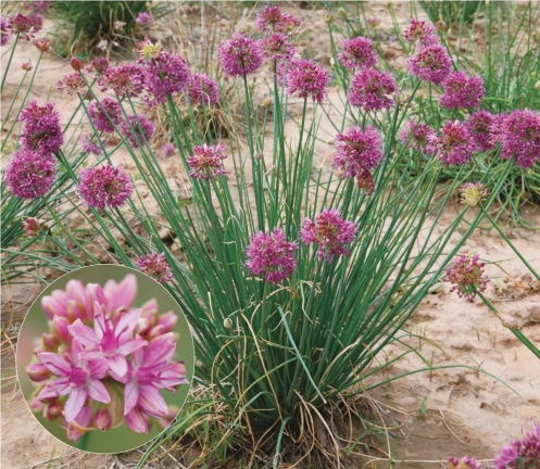 ●描述:多年生草本。鳞茎数枚聚生,窄卵状圆柱形,外皮红色。叶半圆柱状或圆柱状,具4~5条纵棱,短于或稍长于花莛。花莛圆柱状,下部被叶鞘;总苞单侧开裂,常具喙,宿存;伞形花序球状或半球状;花梗近等长,长为花被片2~3倍,常无小苞片;花淡红或深紫色;内轮花被片长圆形或长圆状披针形,外轮稍短,卵形或窄卵形;花丝等长,长为花被片1.5~2倍,基部合生并与花被片贴生,内轮下部1/3~1/2扩大,其扩大部分两侧具齿,外轮锥形;花柱伸出花被。