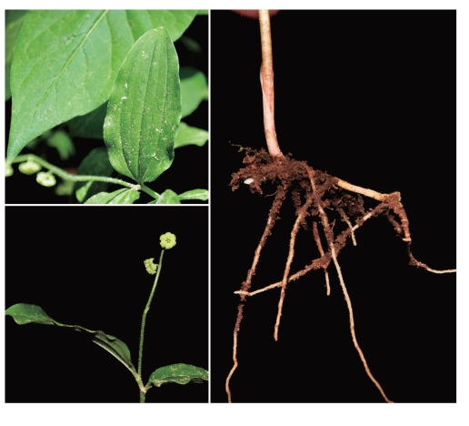 ●描述:多年生草本。根状茎细长。茎下部无毛,中部以上有短粗毛,具2~5枚叶。叶纸质,卵形或矩圆状卵形,先端急尖或渐尖,基部截形或稍心形,近无柄或具短柄。总状花序具2~3朵花,有时多达10朵花;花梗果期稍延长;花白色,有时带紫色;花被片下部合生成杯状筒;裂片矩圆形;花丝与花药近等长;花柱与子房近等长,稍高出筒外。浆果球形。