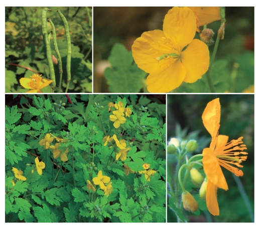 ●描述:多年生草本。茎分枝,被短柔毛,具黄色汁液。基生叶倒卵状长圆形或宽倒卵形,羽状全裂,裂片2~4对,倒卵状长圆形,具不规则深裂或浅裂,裂片具圆齿,上面无毛,下面被白粉,疏被短柔毛;茎生叶互生,具短柄。花多数,伞形花序腋生;具苞片;花瓣4枚,倒卵形,黄色;雄蕊多数,花丝丝状,子房1室,2枚心皮,无毛,胚珠多数,花柱明显,柱头2裂。蒴果近念珠状,无毛,自基部向顶端2瓣裂,柱头宿存。