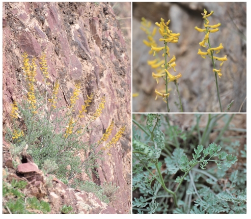 ●描述:多年生灰绿色丛生草本。基生叶具长柄,叶二回羽状全裂,一回羽片4~5对,二回羽片1~2对,3深裂,有时裂片2~3浅裂;茎生叶与基生叶同形,近一回羽状全裂。总状花序多花;苞片窄披针形,边缘近膜质,先端丝状;萼片卵形;花冠黄色,外花瓣先端淡褐色,兜状,无鸡冠状突起,距长为花瓣1/4~1/3,蜜腺长约距1/2,下花瓣舟状,内花瓣具鸡冠状突起,爪与瓣片近等长;雄蕊束披针形;柱头近圆形,具6个短柱状突起。蒴果长圆形,花柱宿存。