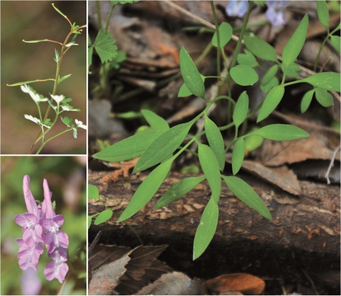 ●描述:多年生草本。茎纤细,基部3枚叶,下部叶具叶鞘及腋生分枝。叶二回三出,小叶常具圆齿或圆齿状深裂,有时侧生小叶全缘或下部叶的小叶分裂成披针形或线形裂片。总状花序具7~13朵花,下部苞片具篦齿或粗齿,上部苞片全缘或具1~2枚齿,花梗纤细,等长或稍长于苞片;花冠桃红或紫红色,稀蓝色,外花瓣宽,全缘,先端微凹,距圆筒状,稍上弯,顶端稍下弯,蜜腺贯穿距长1/2至2/3,下花瓣稍前伸;柱头扁四方形,上端具4个乳突。蒴果线形。