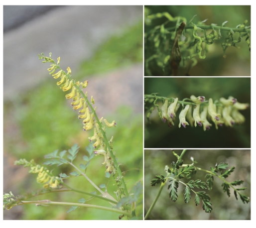 ●描述:丛生灰绿色草本。基生叶多数,叶柄具膜质翅,叶二回或一回羽状全裂,一回羽片4~5对,具短柄,二回羽片2~3对,无柄,倒卵圆形或长圆形,3~5裂;茎生叶与基生叶同形,近一回羽状全裂,叶柄具翅。总状花序多花;苞片线状披针形;花冠淡黄或苍白色,外花瓣先端色较深,距短囊状,蜜腺贯穿距长1/2,下花瓣舟状,内花瓣先端暗紫红或暗绿色,鸡冠状突起伸出顶端,爪短于瓣片;雄蕊束上部缢缩成丝状;子房长于花柱;柱头具4个乳突。蒴果线形。