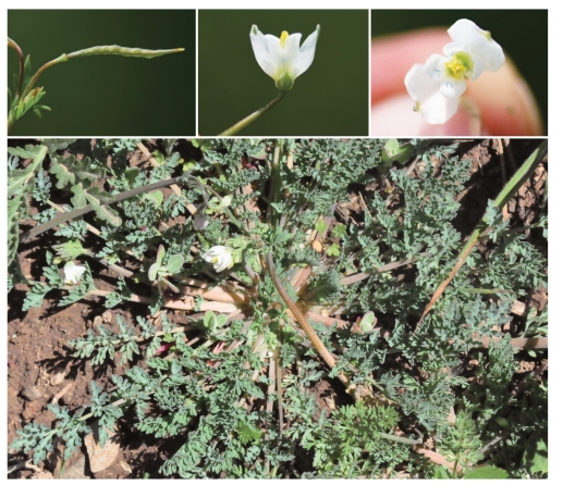 ●描述:一年生草本。茎丛生,铺散而先端向上,多分枝。基生叶二回羽状全裂,裂片4~9对,宽卵形或卵形,羽状深裂;茎生叶同基生叶。花茎常二歧状分枝;花排列成二歧聚伞花序,每花具数枚小苞片;萼片卵形或卵状披针形,常全缘;花瓣淡紫色,外面2枚宽倒卵形,先端绿色,里面2枚较小,3裂几达基部,中裂片匙状圆形,极全缘,侧裂片长卵形或宽披针形,先端钝且极全缘;雄蕊4枚,花药黄色;子房圆柱形,柱头2裂。蒴果直立,圆柱形。