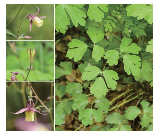 ●描述:多年生草本。茎常分枝。基生叶一至数枚,二回三出复叶;叶柄疏生平展短柔毛;侧生小叶斜卵形,不等2裂至中部;中央小叶宽倒卵形至扇形,3浅裂,裂片具2~3枚钝齿;茎生叶超过两枚。苞片线形至披针形;花序具1~3朵花,花冠二色,下垂;萼片垂直于花序轴,狭卵形,深紫色,先端渐尖;花瓣二色(距暗紫色,瓣片暗黄色),近直立,瓣片矩圆至椭圆形,先端圆截,短于萼片而长于距;距尖端弯曲;雄蕊不外伸,短于或与花瓣等长,花药黄色。
