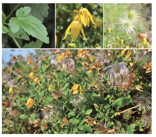 ●描述:木质藤本,在荒漠地区呈矮小灌木状。一至二回羽状复叶;小叶菱状卵形或窄卵形,先端尖,具小牙齿,两面脉疏被柔毛。花单生枝顶,或1~3朵组成腋生花序;苞片似小叶;萼片4枚,黄色,具时带紫色,窄卵形或长圆形,顶端常骤尖,疏被柔毛,边缘被柔毛;花丝被柔毛,花药无毛,顶端具不明显小尖头。