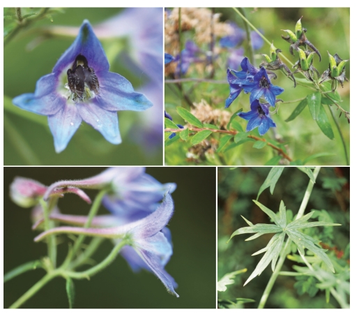●描述:多年生草本。茎多分枝。叶片五角形,三全裂近基部,中央全裂片三深裂或不裂,侧全裂片扇形,不等二深裂,二回裂片不等二至三裂,末回小裂片披针形至条形,两面均被白色短伏毛。伞房花序有2~7朵花,顶端5~6朵常排列成伞状;苞片三裂或不裂而呈线形;小苞片生花梗中部上下,线形或钻形;萼片宿存,蓝紫色,椭圆状卵形,外面被短柔毛,距钻形,直或末端稍向下弯曲;花瓣上部黑褐色;退化雄蕊的瓣片二浅裂,腹面中央有淡黄色髯毛;雄蕊无毛;心皮3枚。