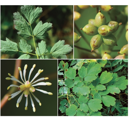 ●描述:多年生草本。植株无毛。茎中部叶具短柄,三回三出复叶;小叶草质,菱状宽倒卵形或宽菱形,3浅裂,疏生齿,下面网脉稍隆起。花序上部分枝呈伞房状,或密集呈伞形;萼片4枚,绿白色,早落,椭圆形;雄蕊15~20枚,花丝上部窄倒披针形,下部丝状;心皮3~7枚,花柱腹面顶端具近球形小柱头。瘦果扁球形,具短柄,宿存花柱短。
