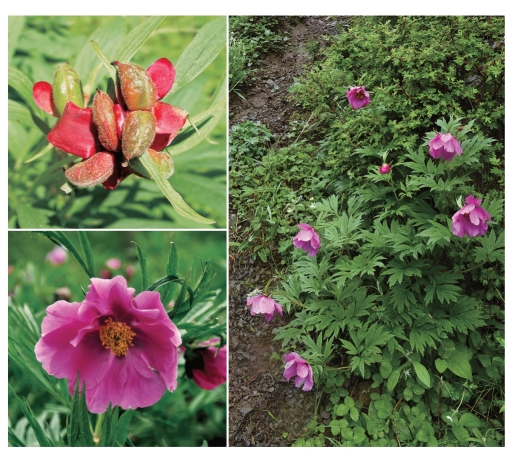 ●描述:多年生草本。二回三出复叶,叶片轮廓宽卵形;小叶成羽状分裂,裂片窄披针形至披针形,顶端渐尖,全缘,表面深绿色,背面淡绿色。花2~4朵,生茎顶端及叶腋,有时仅顶端一朵开放,叶腋有发育不好的花芽;苞片2~3枚,分裂或不裂,披针形;萼片4枚,宽卵形;花瓣6~9枚,倒卵形,紫红色或粉红色;花盘肉质,仅包裹心皮基部;心皮2~3枚,密生黄色绒毛。蓇葖果密生黄色绒毛。