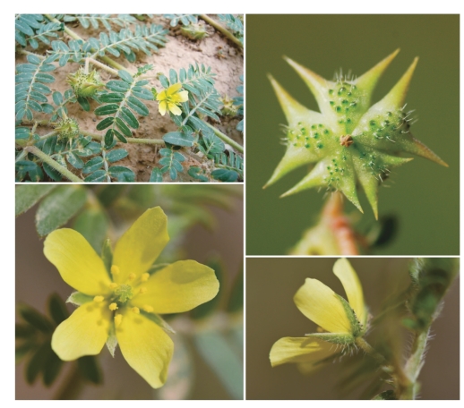 ●描述:一年生草本。茎由基部分枝,平卧,淡褐色;全体被绢丝状柔毛。偶数羽状复叶互生;小叶6~14枚,对生,矩圆形,顶端锐尖或钝,基部稍偏斜,近圆形,全缘。花小,黄色,单生叶腋;花梗短;萼片5枚,宿存;花瓣5枚;雄蕊10枚,生花盘基部,基部有鳞片状腺体。果为5个分果瓣组成,每果瓣具长短棘刺各1对;背面有短硬毛及瘤状突起。