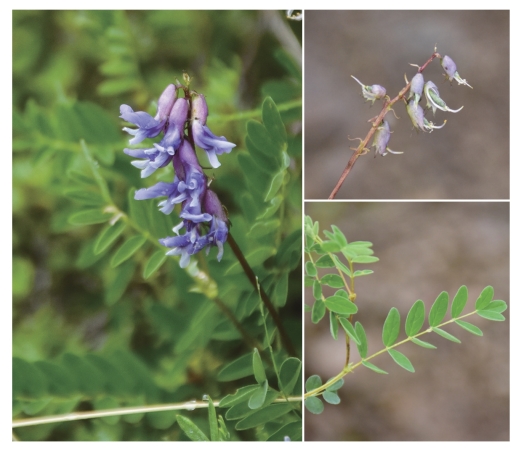 ●描述:多年生草本。茎外倾或平铺。羽状复叶有7~13片小叶;托叶三角状或宽卵形,渐尖;小叶互生,椭圆状长圆形,先端钝,有短尖头,基部宽楔形。总状花序生7~9朵花,呈伞形,疏被黑色毛或近无毛;总花梗较叶长;苞片线形或披针状线形,近膜质;花梗密被黑色毛;小苞片线形,稍具毛;花萼钟状,被褐色毛,萼齿三角状披针形;花冠青紫色,旗瓣瓣片近圆形,先端微缺,翼瓣瓣片狭长圆形,龙骨瓣瓣片近倒卵形。荚果膨胀,椭圆形,先端尖喙状。