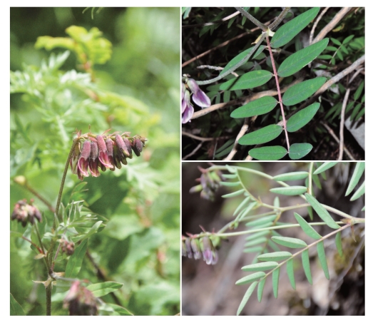●描述:多年生草本。茎直立,通常中部以下无叶,仅有叶鞘,叶鞘膜质,卵形,抱茎。羽状复叶有9~17片小叶;托叶离生,披针形;小叶线状披针形,先端渐尖,基部钝圆,上面绿色,下面灰绿色。总状花序稍密集,有10余朵花;总花梗与叶近等长或稍长;苞片披针形;花萼钟状,萼齿三角状披针形;花冠黑紫色,旗瓣先端微凹,基部渐狭成瓣柄,翼瓣瓣片长圆形,具短耳,龙骨瓣较翼瓣稍短;子房被黑色短柔毛。荚果膜质,膨大,梭形或披针形。
