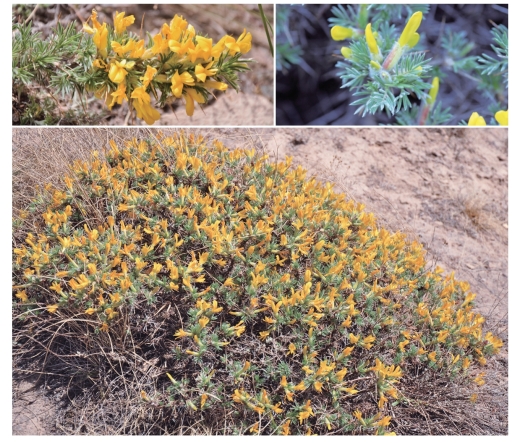 ●描述:垫状矮灌木。密丛生,常呈垫状。羽状复叶有小叶3~4对;托叶卵形或近圆形,膜质;叶轴密生,全部硬化成针刺状,宿存,淡褐色;小叶线形,先端尖,有刺尖,基部窄,两面密被银白色伏贴长柔毛。花单生,近无梗;花萼管状;花冠黄色,旗瓣倒卵形,翼瓣瓣柄与瓣片近等长,龙骨瓣瓣柄稍长于瓣片,耳均短小,齿状;子房密被柔毛。荚果椭圆形,外面密被柔毛,里面密被绒毛。