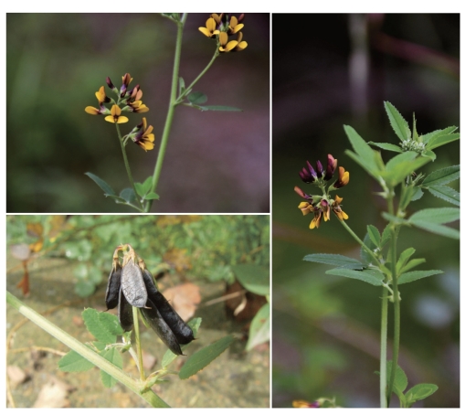 ●描述:多年生草本。茎直立或上升,四棱形,基部分枝,丛生。羽状三出复叶;托叶披针形,锥尖,耳状,具1~3枚浅齿;小叶倒披针形、楔形或线形,边缘1/4以上具尖齿;顶生小叶稍大。花序伞形,腋生,具6~9朵密生的花;苞片刺毛状;花萼钟形;花冠黄褐色,中央有深红或紫色条纹。荚果长圆形或卵状长圆形,扁平,顶端具短喙,基部窄尖并稍弯曲,腹缝有时具流苏状窄翅。