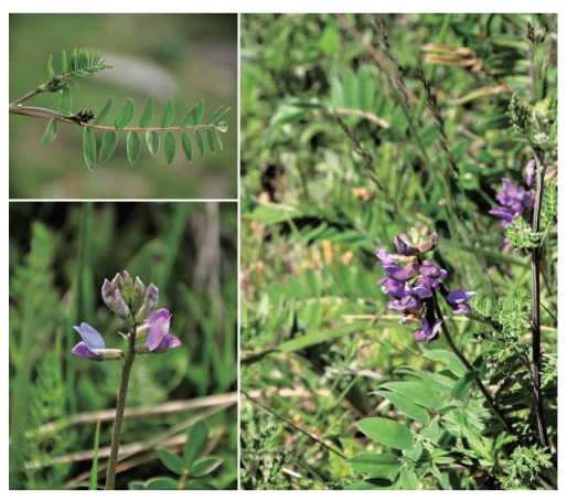 ●描述:多年生草本。茎直立,基部多分枝,无毛、疏被柔毛或密被贴伏黄色粗毛。羽状复叶长5~10厘米;托叶卵状三角形,分离;叶柄与叶轴通常疏被开展的黄色短柔毛,稀无毛;小叶21~31枚,卵状披针形或椭圆形,先端尖,基部圆,两面疏被黄色平伏柔毛。多花组成头形的密总状花序;花萼钟状,密被开展的黑色长柔毛,萼齿披针形;花冠蓝色。荚果近革质,长圆形,膨胀,被开展疏柔毛,喙甚短。