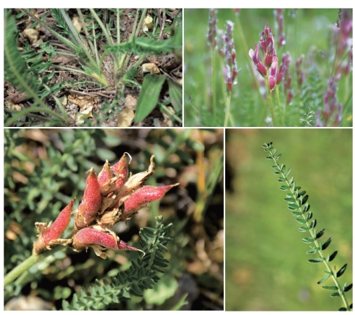 ●描述:多年生草本。茎缩短,丛生。羽状复叶轮生,小叶12~16轮,每轮4~8枚,线形、长圆形或披针形,先端渐尖,基部圆,两面密被长柔毛;托叶膜质,卵状披针形。多花组成紧密或较疏松的总状花序;苞片披针形,被长柔毛;花萼筒状,被长柔毛,萼齿披针形;花冠淡红紫色,旗瓣长椭圆形,先端圆或微凹,基部下延成瓣柄,翼瓣先端急尖;子房线形,被毛。荚果披针状椭圆形,革质,密被长柔毛。