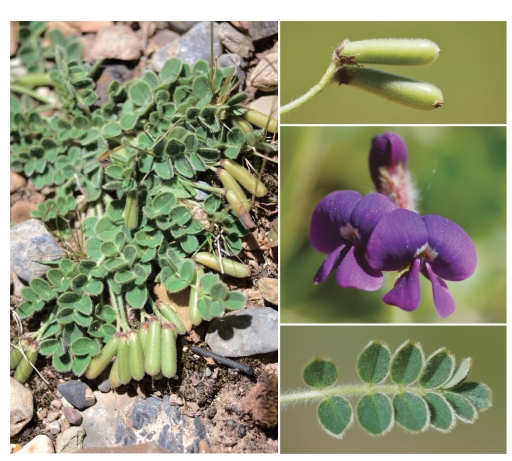 ●描述:多年生草本。叶长2~7厘米,叶柄被稀疏长柔毛;托叶大,卵形;小叶9~13枚,圆形至椭圆形、宽倒卵形至卵形,顶端微缺至深缺,被贴伏长柔毛。伞形花序具1~3朵花,稀4朵;总花梗与叶等长或较叶长;苞片长三角形;花萼钟状,上2枚萼齿较大,下3枚萼齿较狭而短;花冠深蓝紫色;旗瓣卵状扁圆形,顶端微缺至深缺;翼瓣宽楔形具斜截头,线形;龙骨瓣近长方形;花柱折曲成直角。荚果圆筒形或有时稍扁,被稀疏柔毛或近无毛。