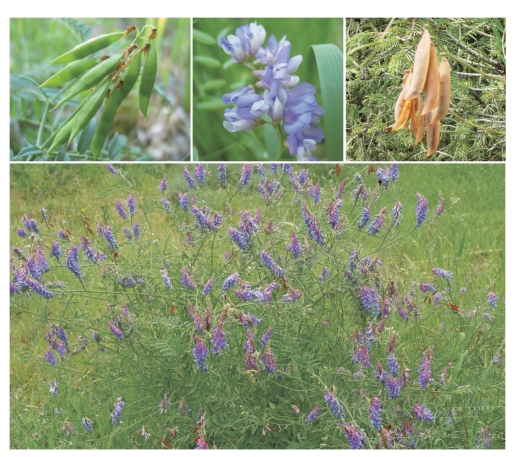 ●描述:多年生草本。茎攀援或蔓生,有棱,被柔毛。偶数羽状复叶,叶轴顶端卷须2~3个分支;托叶半箭头形或戟形,上部2深裂;小叶5~12对,互生,线形、长圆形或线状披针形,全缘,叶脉稀疏,呈基生三出脉。总状花序与叶轴近等长;花10~40朵密集;花萼钟状,萼齿5枚;花冠紫、蓝紫或紫红色;花柱弯曲与子房呈大于90°夹角,上部四周被毛。荚果长圆形或长圆菱形,顶端有喙。