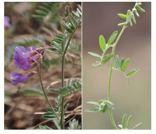 ●描述:多年生草本。茎纤细,具棱,无毛。偶数羽状复叶,叶轴末端有卷须;托叶披针形或椭圆形;小叶8~10枚,狭长圆形,先端钝,微凹,基部圆形,无毛。总状花序短于叶,常具花4朵,密集于花序轴顶端;苞片早落;花萼钟状,萼齿三角形或近披针形,最上面的2齿略短;花冠蓝紫色;旗瓣提琴形,先端微凹,中部缢缩,基部宽楔形;翼瓣与旗瓣近等长,龙骨瓣略短于翼瓣。荚果长圆形,无毛。