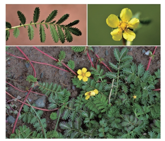 ●描述:多年生草本。茎匍匐,在节处生根。基生叶为间断羽状复叶,有小叶6~11对;小叶对生或互生;小叶片通常椭圆形、倒卵椭圆形或长椭圆形,顶端圆钝,基部楔形或阔楔形,边缘有多数尖锐锯齿或呈裂片状,下面密被紧贴银白色绢毛,茎生叶与基生叶相似,唯小叶对数较少;基生叶和下部茎生叶托叶膜质,上部茎生叶托叶草质,多分裂。单花腋生;萼片三角卵形,顶端急尖或渐尖,副萼片椭圆形或椭圆披针形,常2~3裂稀不裂;花瓣黄色,倒卵形、顶端圆形。