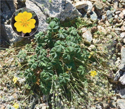 ●描述:多年生草本。花茎直立或上升,被白色绒毛及疏长柔毛。基生叶3~5枚掌状复叶,小叶长圆状倒卵形,先端圆钝或急尖,基部楔形,有多数缺刻状锯齿,下面密被白色绒毛,沿脉贴生疏柔毛;茎生叶1~2枚,小叶3~5枚,与基生叶相似;基生叶托叶膜质,褐色,茎生叶托叶草质,绿色,卵形或卵状披针形。花多数排成顶生疏散聚伞花序;萼片三角状卵形或三角状披针形,副萼片披针形;花瓣黄色,倒卵形,先端凹;花柱近顶生,基部微膨大,柱头略扩大。