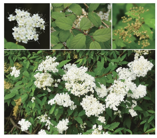 ●描述:灌木。叶片卵状长圆形至卵状披针形,先端急尖或短渐尖,基部圆形至近截形,边缘有缺刻和重锯齿,上面绿色,被稀疏短柔毛。复伞房花序生在侧枝先端,有多数花朵;苞片卵状披针形至线状披针形,先端急尖,基部楔形,有少数锯齿,两面被短柔毛;萼筒钟状,内外两面有短柔毛;萼片三角形,先端急尖;花瓣卵形至近圆形,先端钝,白色;雄蕊20枚,长于花瓣;花盘圆环形,有10个肥厚裂片。蓇葖果开张,花柱顶生,萼片反折。