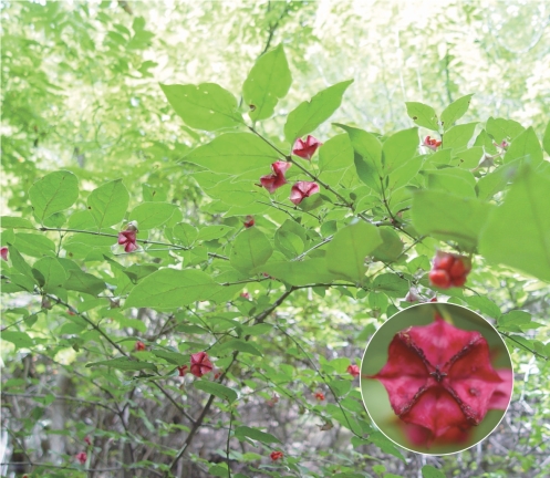●描述:落叶灌木。叶厚纸质,椭圆形或长方窄倒卵形,先端急尖或钝,有时呈尖尾状,基部多为阔楔形或楔形,边缘有较硬锯齿,侧脉6~10对,在两面均较明显。聚伞花序松散;花序梗长而细弱,顶端具3~5次分枝;花紫绿色;萼片近圆形;花瓣阔卵形或近圆形;花盘微4裂,雄蕊着生裂片上;子房无花柱。蒴果具4翅,常微下垂。