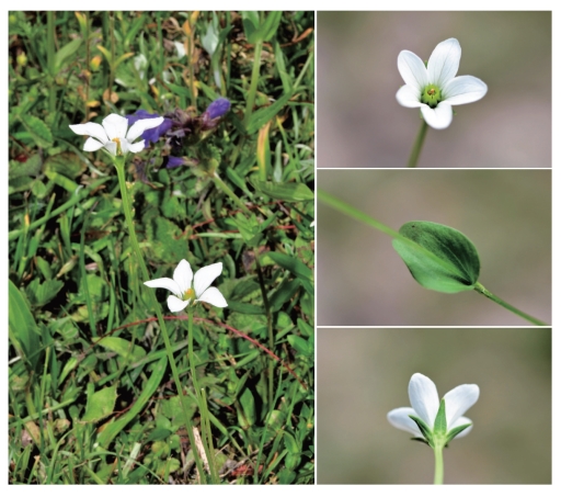 ●描述:多年生小草本。基生叶2~8枚,叶片卵状长圆形或三角状卵形,先端圆,有时带短尖头,基部常截形或微心形,有时下延于叶柄,全缘,有3~5条明显突起之脉;茎(1~)2~9条或更多,在中部或中部以下具1枚叶(苞叶),茎生叶卵状长圆形,先端急尖,无柄半抱茎。花单生于茎顶;萼筒钟状;萼片披针形,具明显3脉;花瓣白色,宽匙形或倒卵长圆形,先端圆,基部渐窄成爪,有5条紫褐色之脉;雄蕊5枚;退化雄蕊5枚,先端3深裂;柱头3裂。蒴果长卵球形。